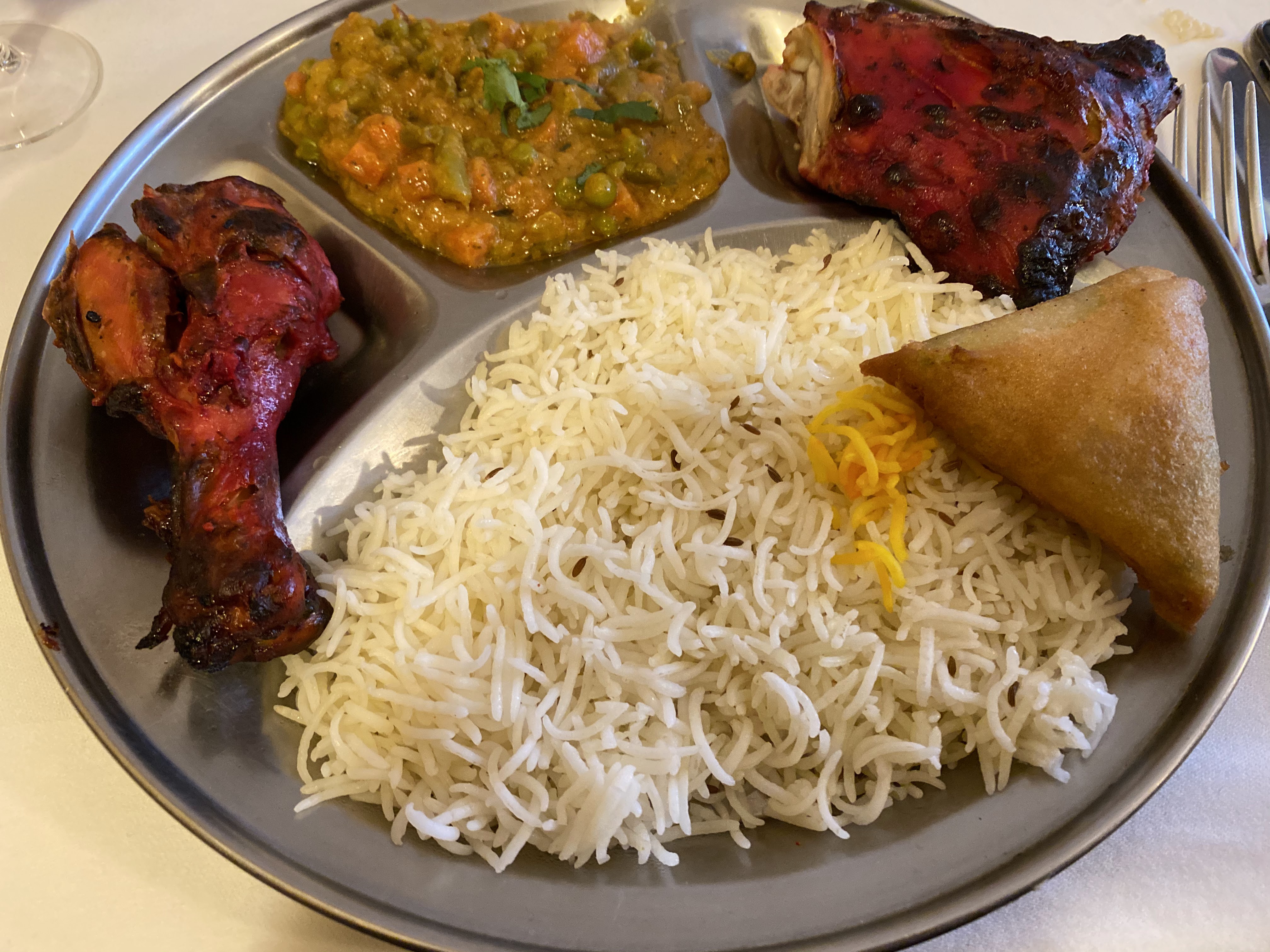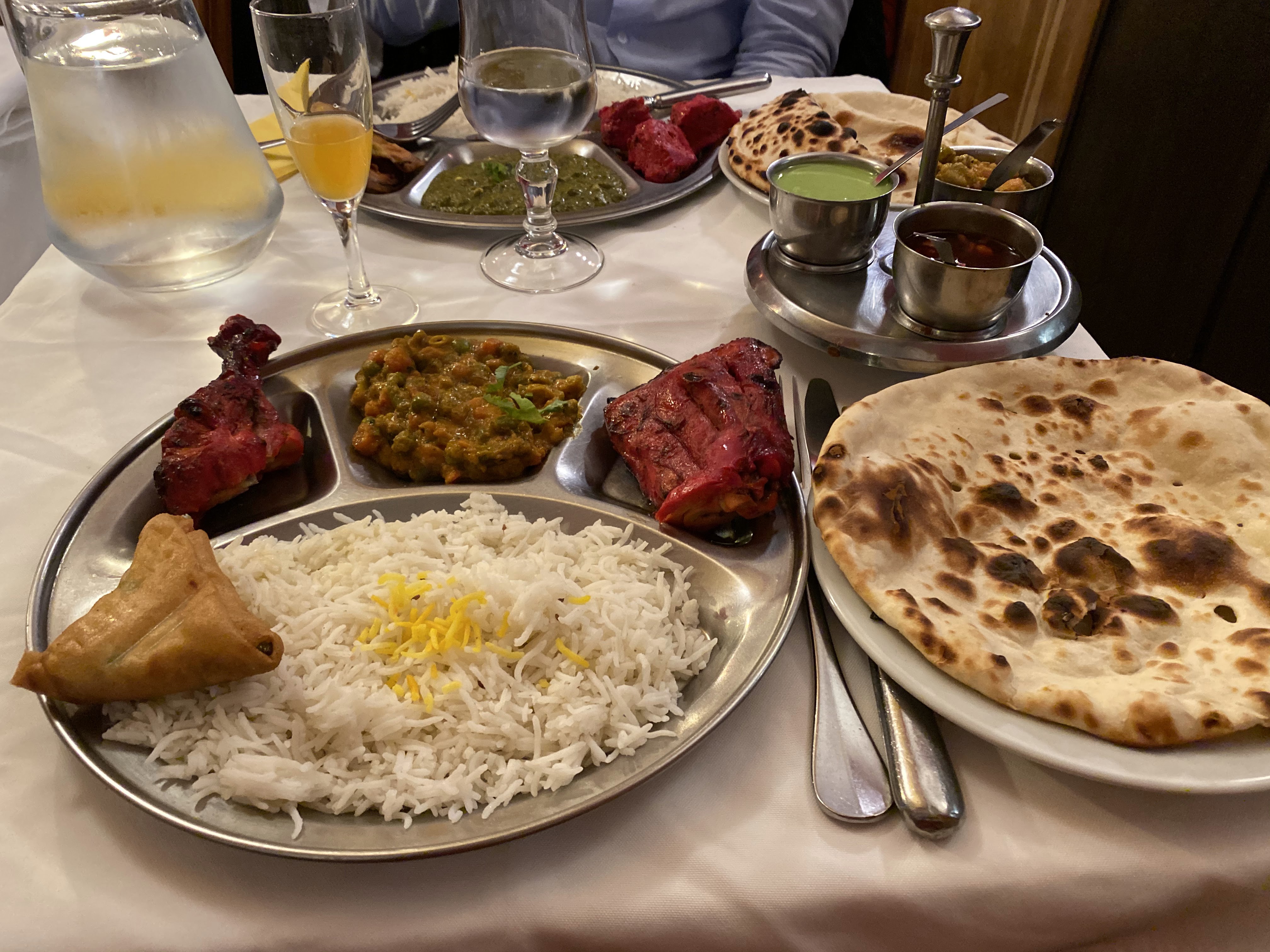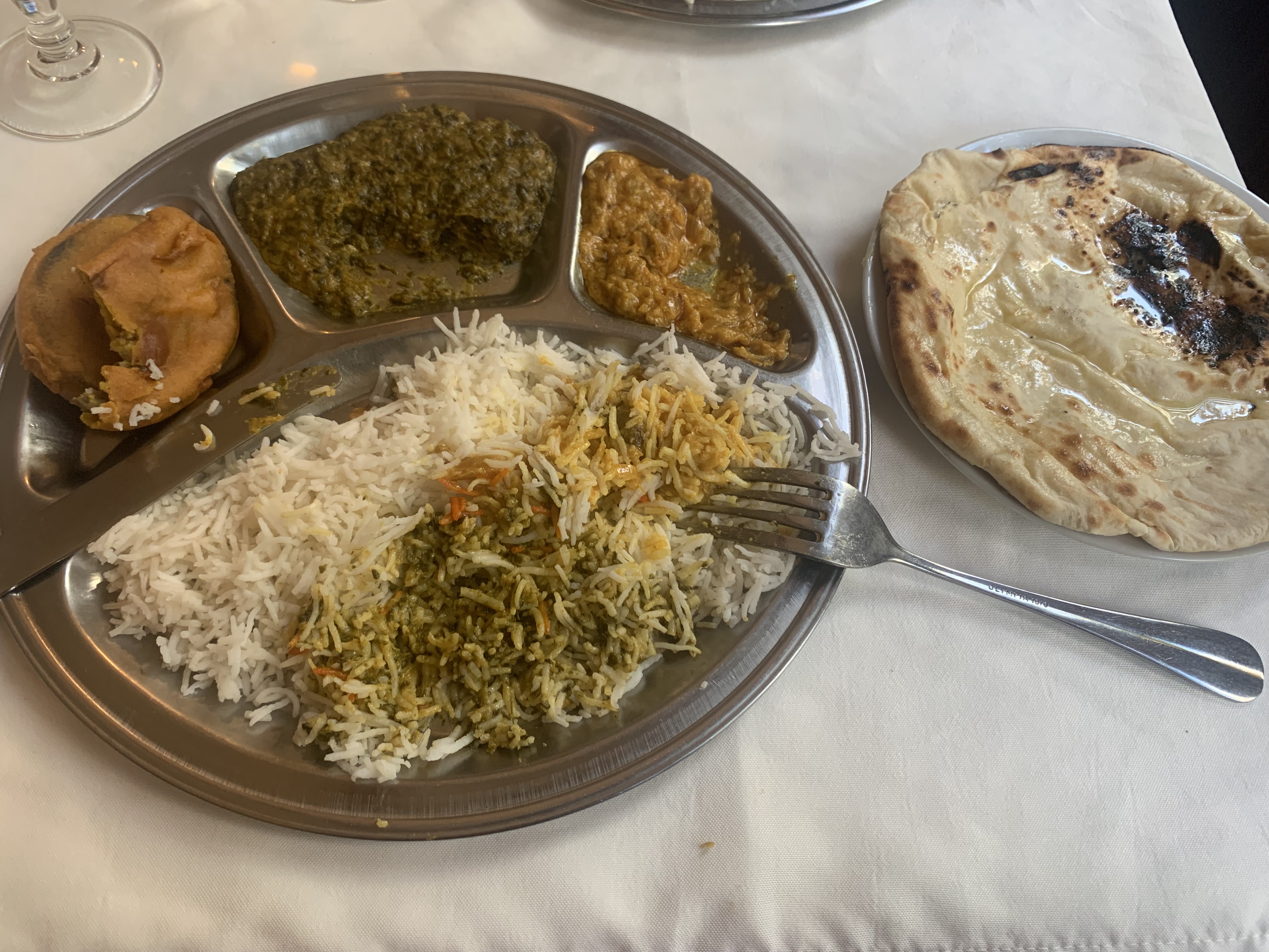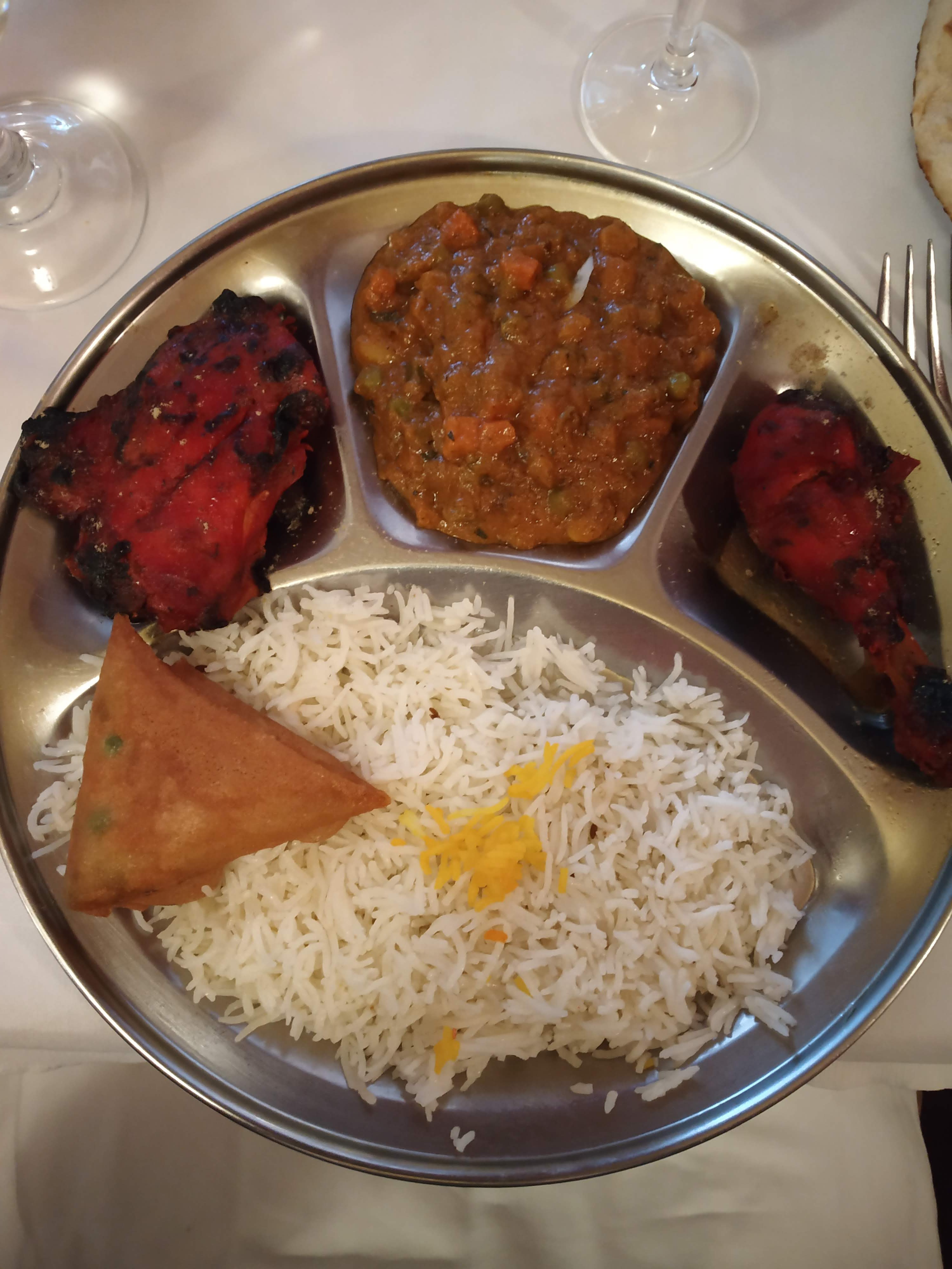 Un serveur totalement débordé entre la salle, l'emporté et les livreurs. Je me suis retrouvé déplacé près des WC... J'ai commandé un thali. Le seul truc correct était le poulet tandoori. C'était plutôt froid et insipide. Heureusement pas cher, mais mieux vaut prendre un menu sandwich dans une boulangerie...