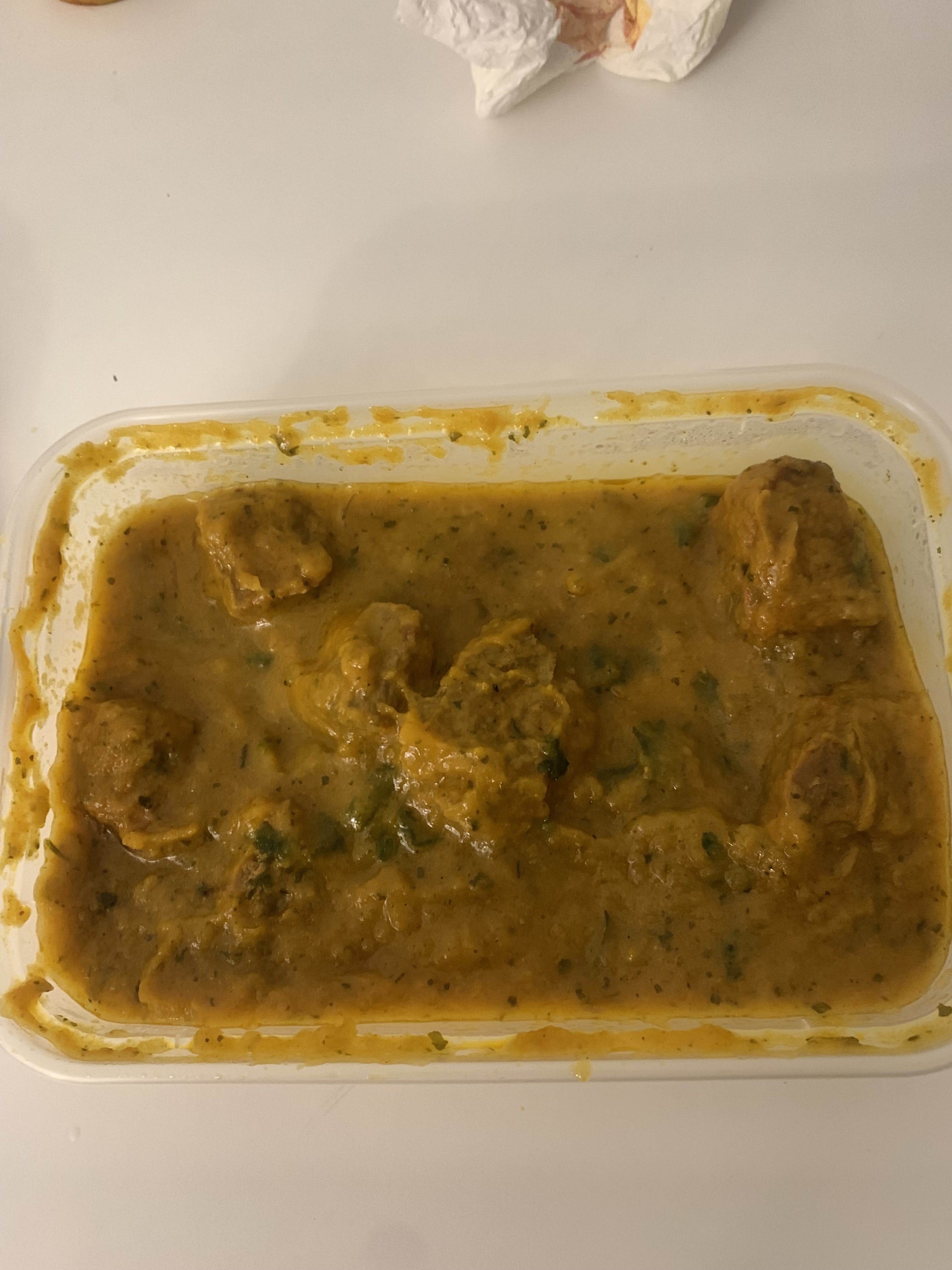 Un poulet Vindaloo avec 3 morceaux de viande, une demi pomme de terre et une sauce coupée à l'eau. Bien joué les mecs, ne changez rien.