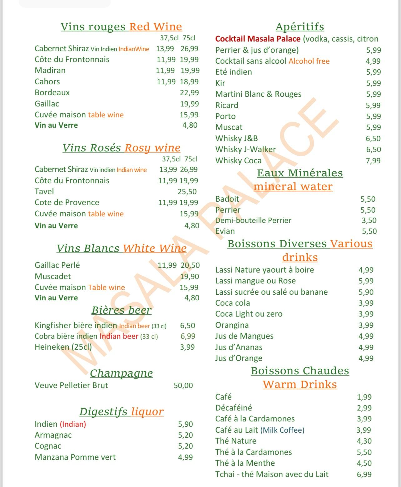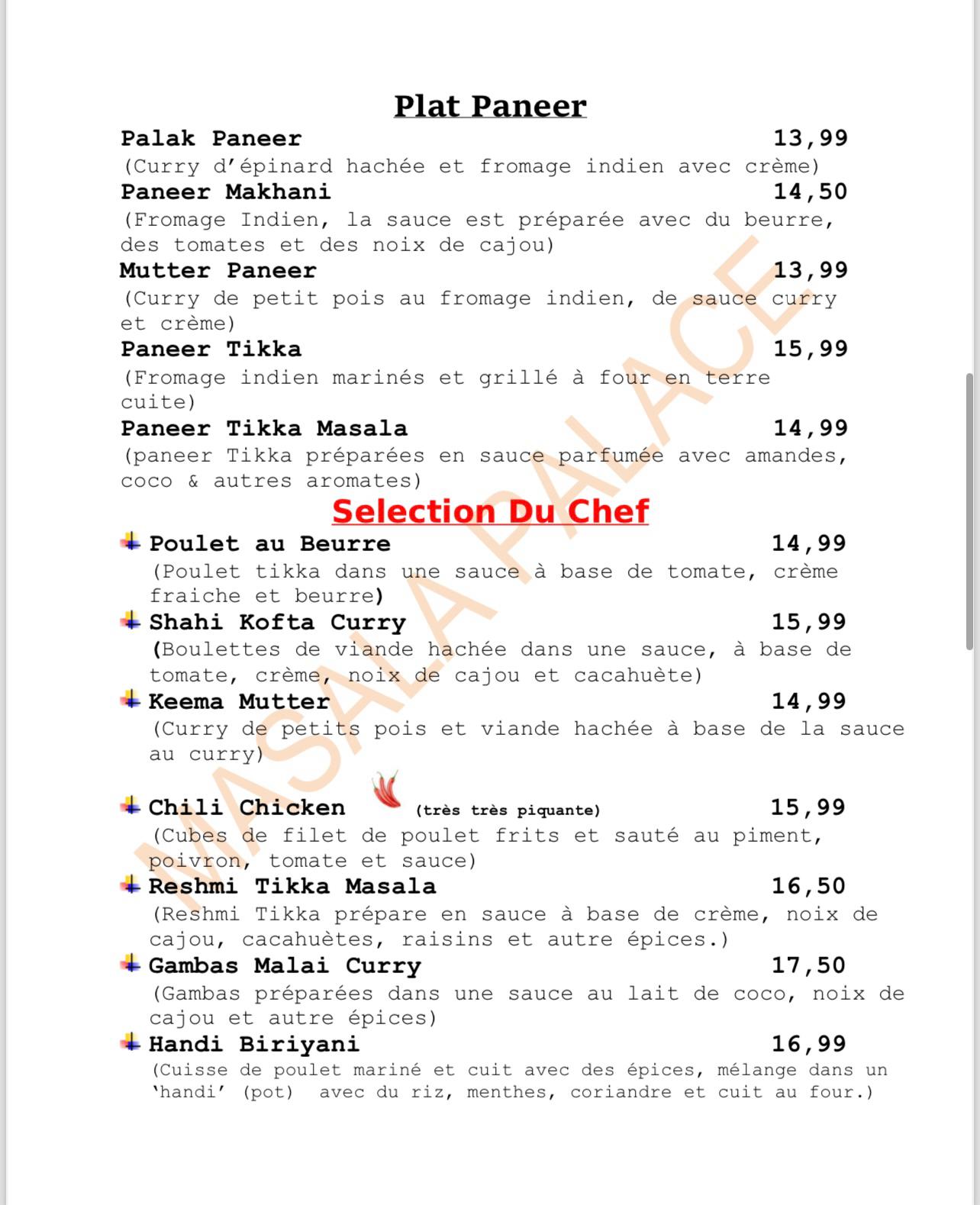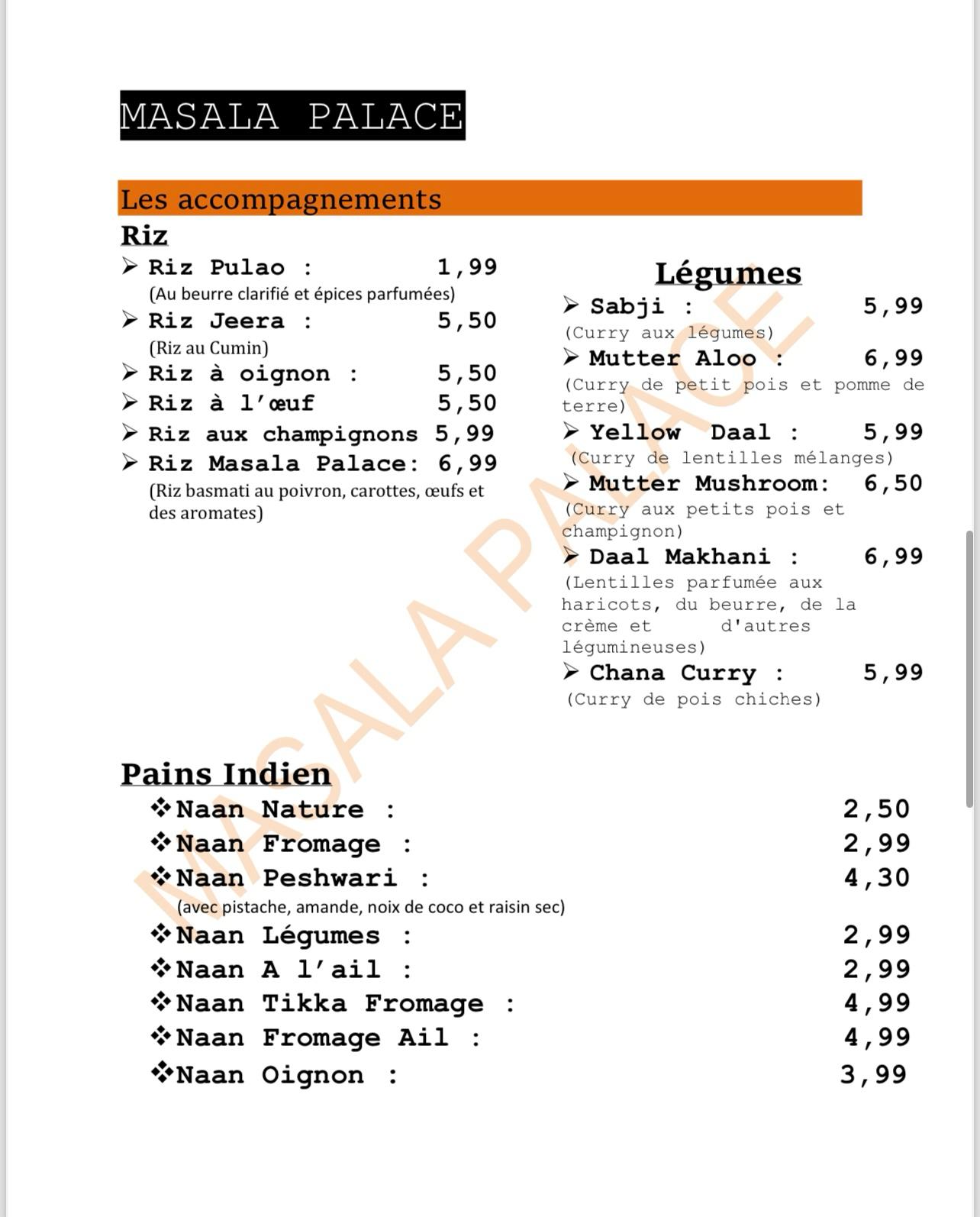 Nous avons mangé ce soir au Masala Palace. La nourriture très très bonne, service impeccable, serveur très gentil et aux petits soins Bon rapport qualité prix, car les prix sont abordables Merci pour tout et bonne continuation !!!