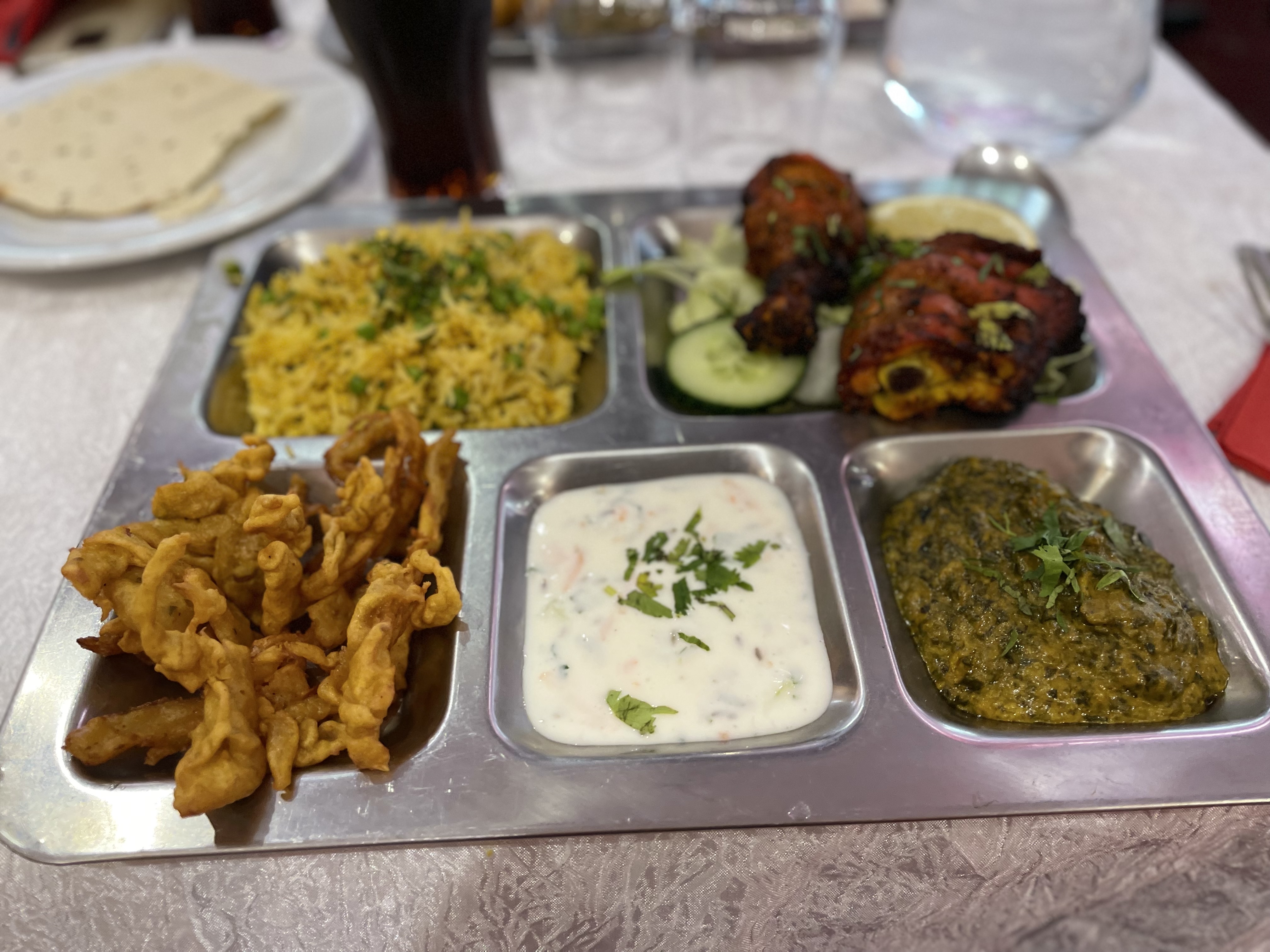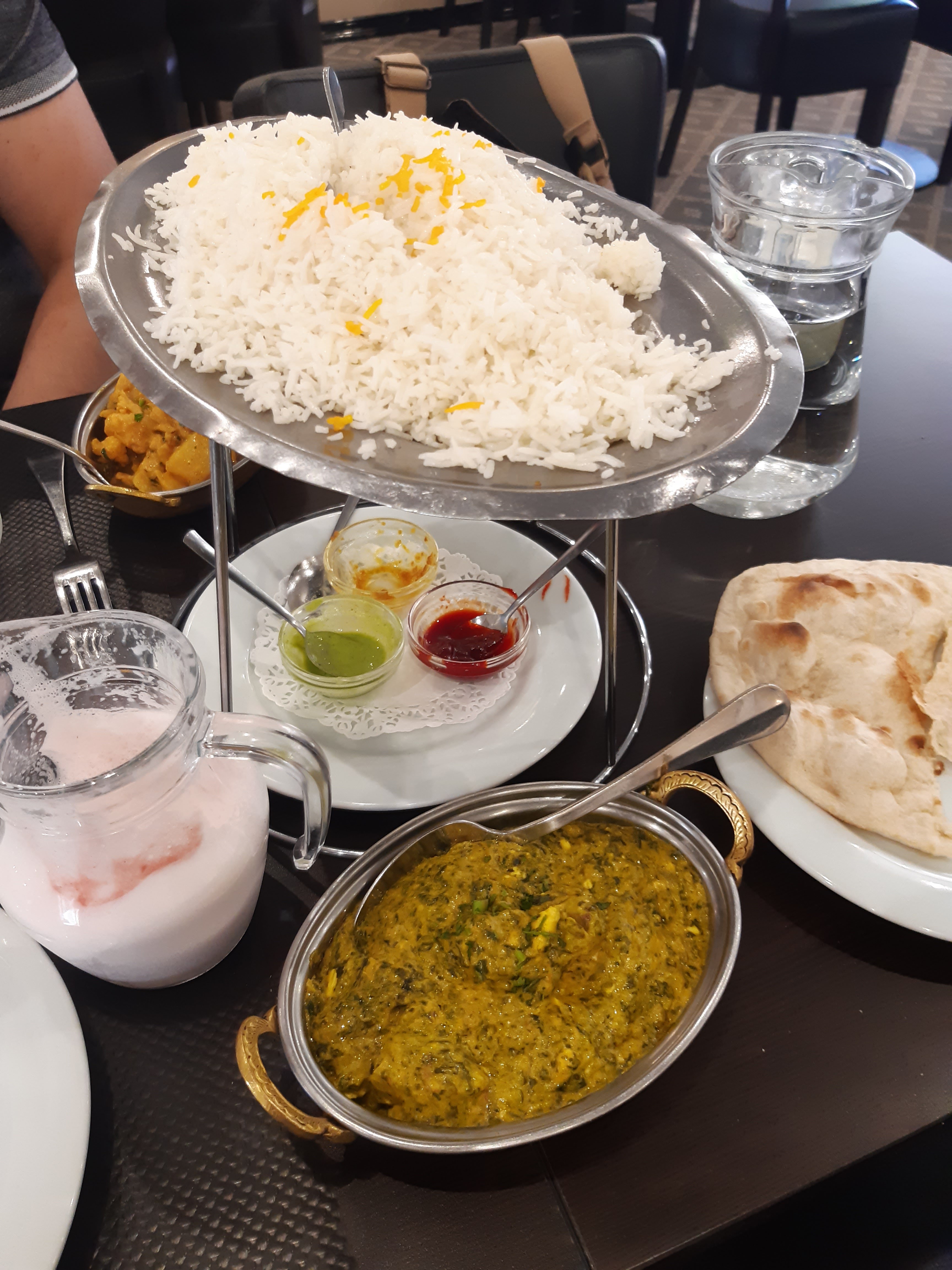 Superbe découverte que ce grand et beau restaurant Indien et Pakistanais situé à 15 minutes à pied du cœur de ville de La Varenne Saint Hilaire. Un accueil vraiment sympathique et chaleureux, une large gamme de produits à la carte, plusieurs menus pour des formules du midi à des prix vraiment étudiés, des plats succulents et des portions généreuses qui conviendront à tous les goûts, perso c'est sûr, nous reviendrons. A titre d'exemple, nous avons choisi la formule à 13,90 € avec entrées, plats, pain et accompagnement. Je ne suis pas certain d'avoir bien retenu les noms de tous les plats, mais ce dont mes papilles se souviendront ce sont des beignets d'oignons et de pommes de terres croustillants, du riz parfaitement cuit et épicé qu'on croirait sorti d'une pub Uncle Bens tellement il était léger et des spécialités gratins épinards / pommes de terre et chou-fleur / pommes de terre à tomber...par terre, justement. Si l'on ajoute à cela la découverte du Lassi à la Menthe ou Fraise (ou Mangue, ou rose, ou banane, ou autre), une boisson locale, sorte de Smoothie Indien au yaourt, aussi frais que crémeux et en note finale un délicieux thé à la menthe, tout était parfait, même le passage aux toilettes, accessibles aux PMR, grandes et très propres ! Seul petit axe d'amélioration à mon sens, la musique et les chorégraphies musicales de la télévision de la salle, un poil trop présentes d'un point de vue sonore, pour qui n'est pas un fan aguerri de Boolywood ou des musiques indiennes, mais cela reste un détail qui ne gâche pas le plaisir général ;-)