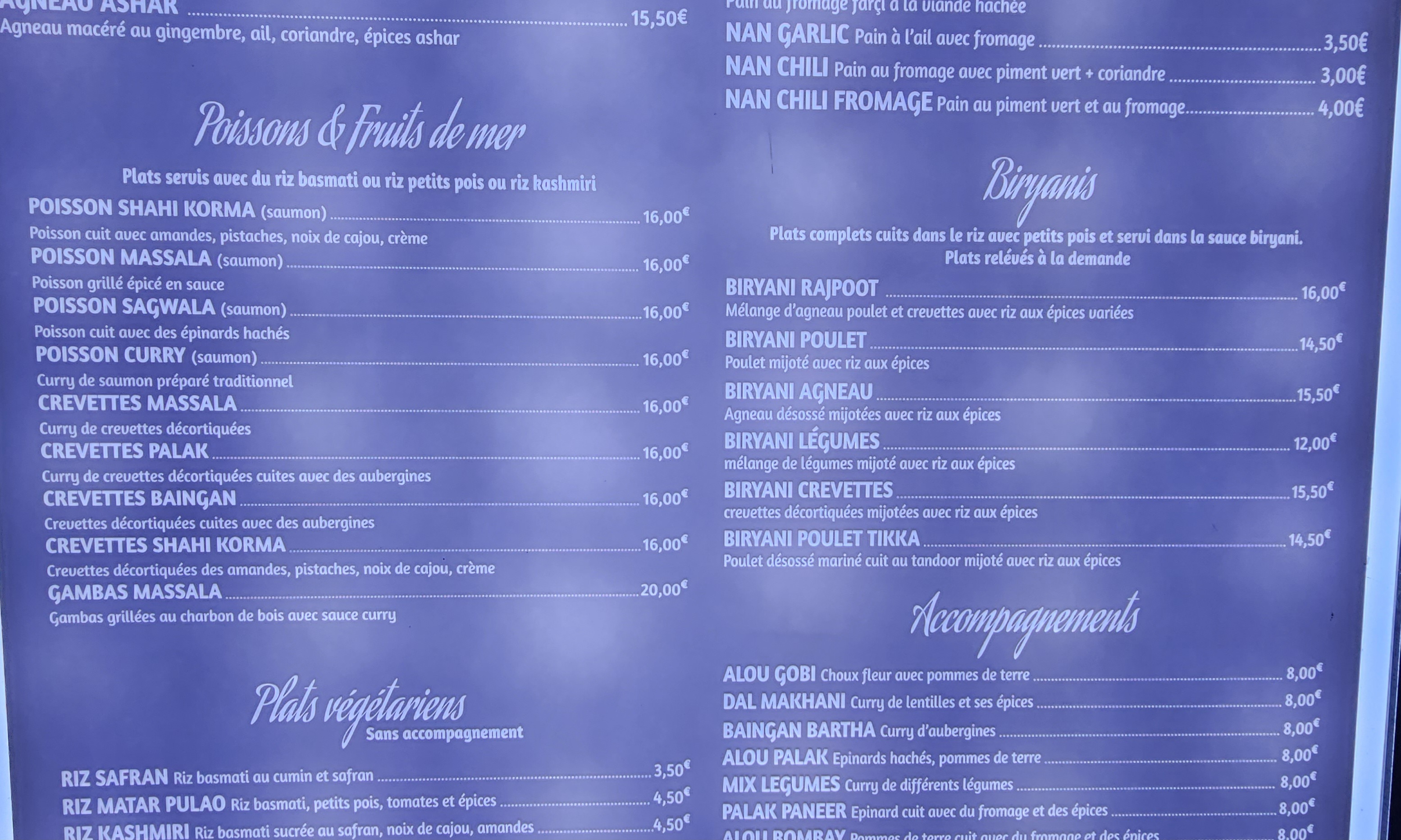 Les plats et sauces sont très bons ! Généreuse portion de riz pour les accompagner. Les prix sont un peu élevés mais corrects au vu des quantités comparé à d’autres restaurants indiens L’emplacement est top ! Très belle place à St Maur Petit bémol sur le temps d’attente qui a été un peu long mais nous étions beaucoup donc cela peut s’expliquer.
