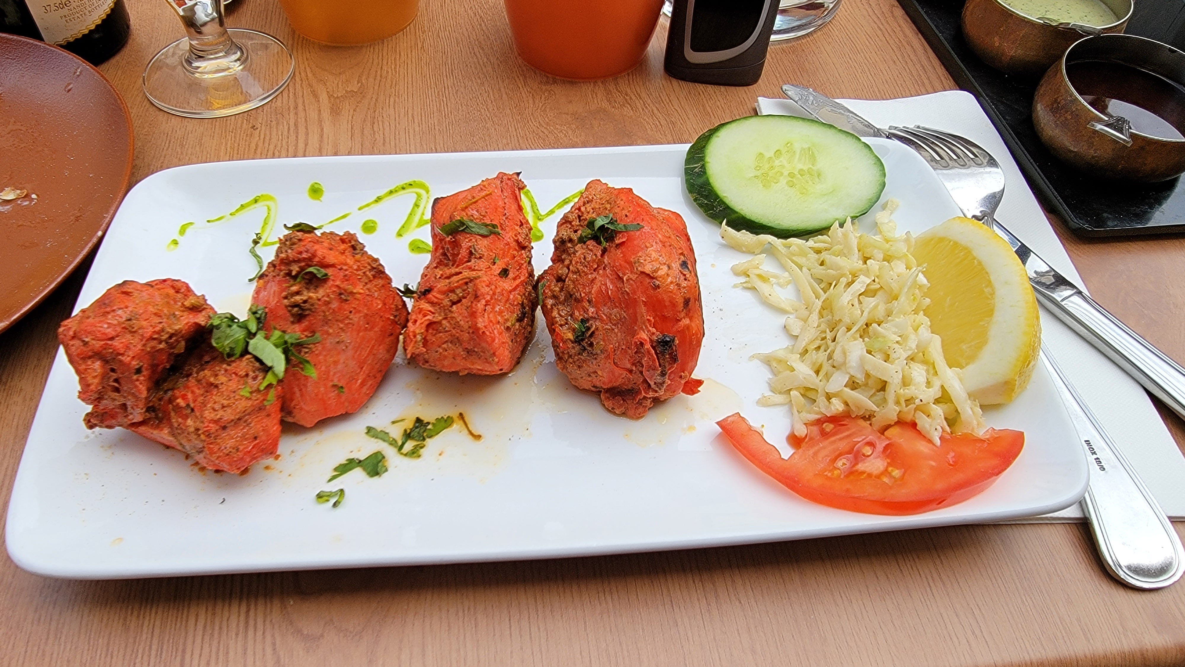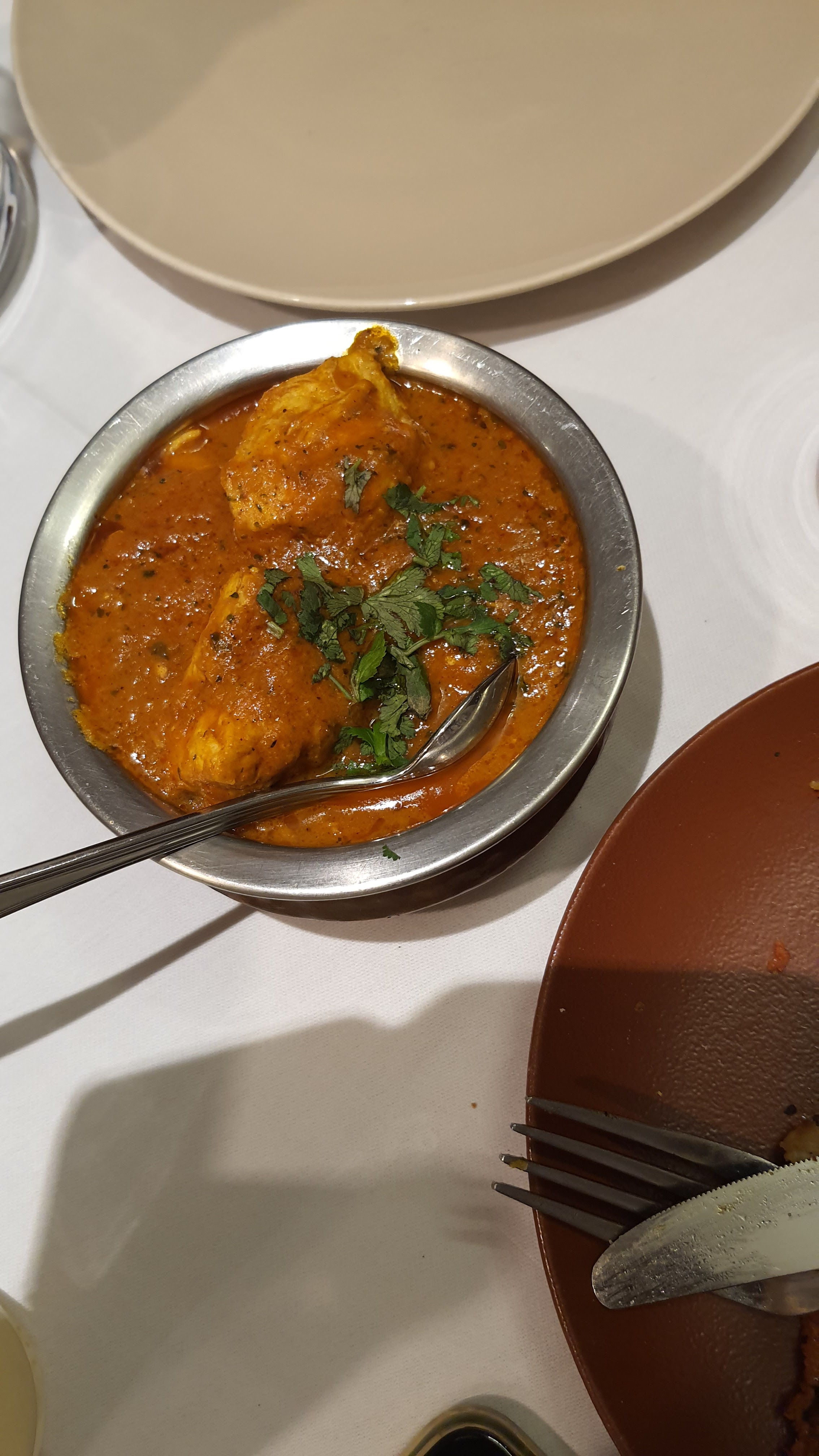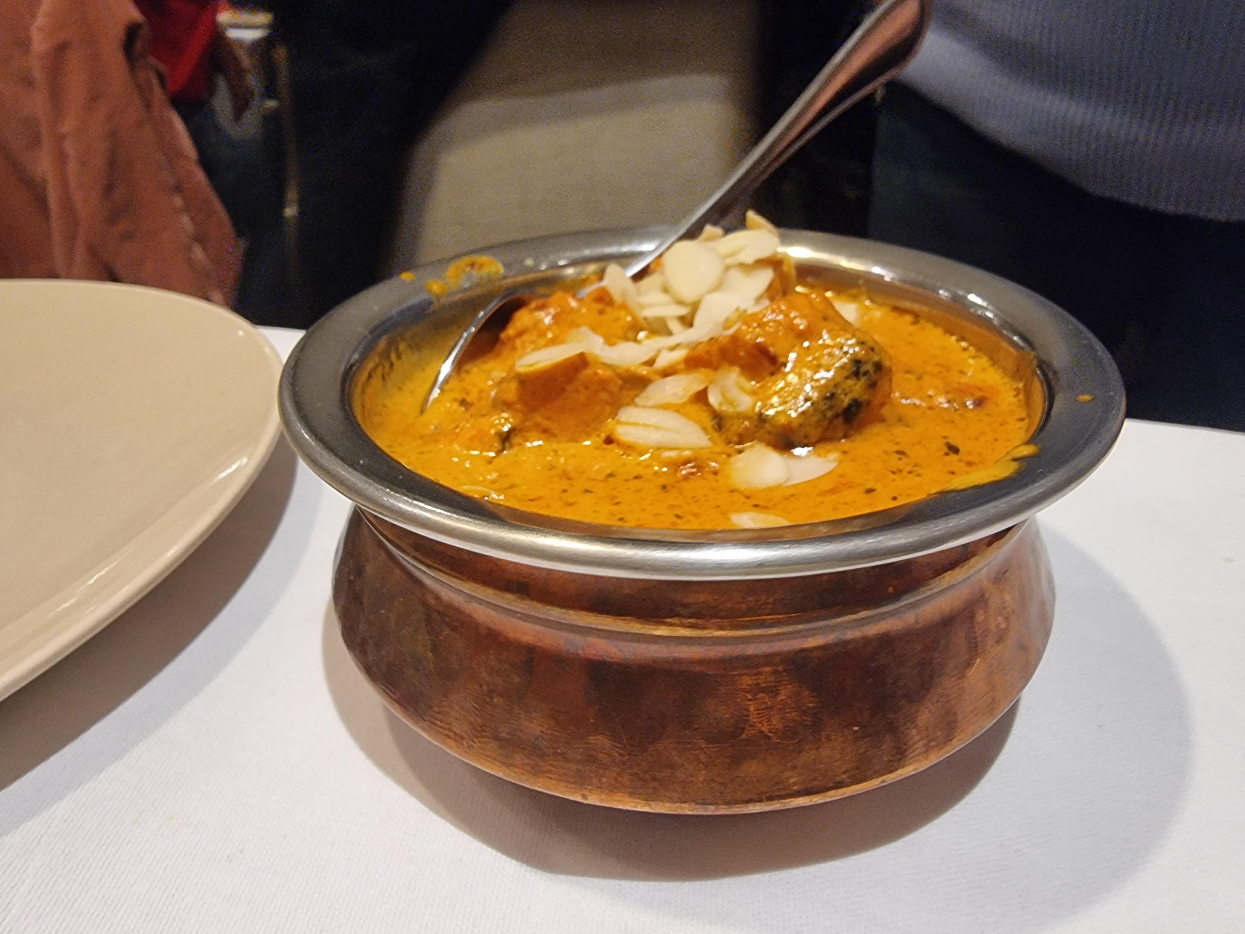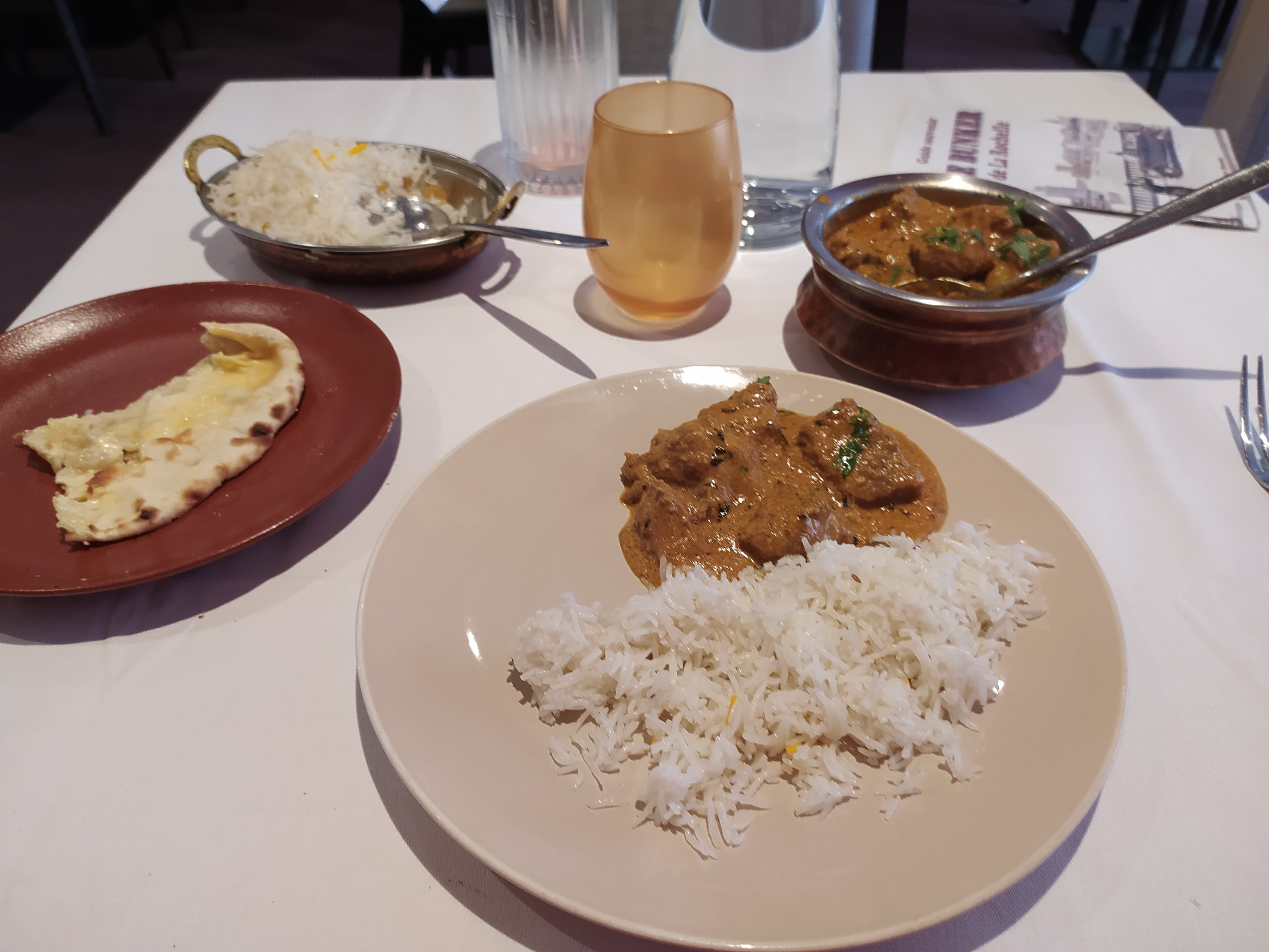Très bon accueil et service de la part du personnel aux petits soins, pour ma part j'ai pris du poulet tikka massala, assez bon. Évidemment chacun a sa façon de cuisiner, car j'ai déjà mangé ce plat ailleurs où la saveur était bien meilleure, et le naan à l'ail (pain indien) manquait de saveur
