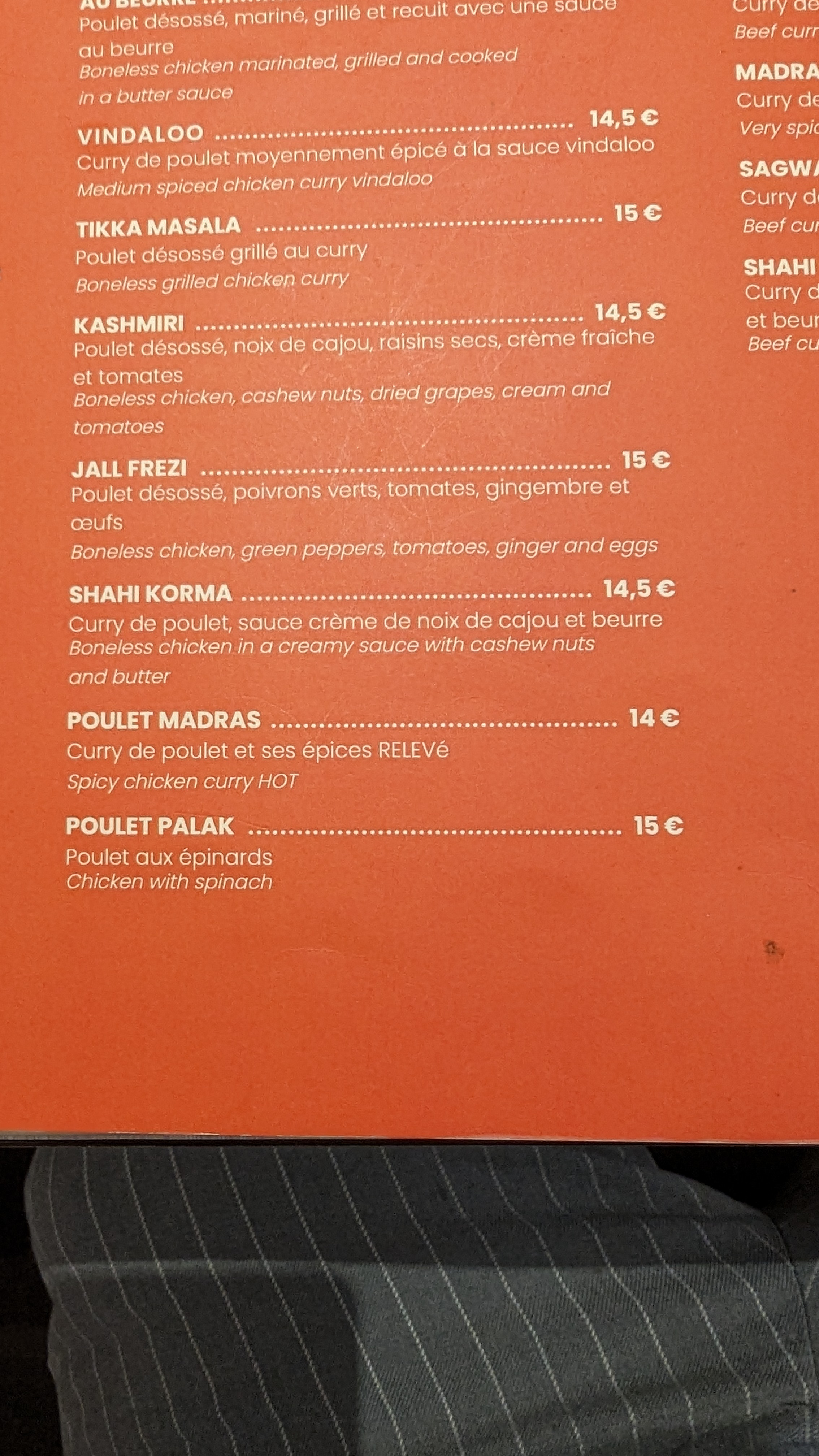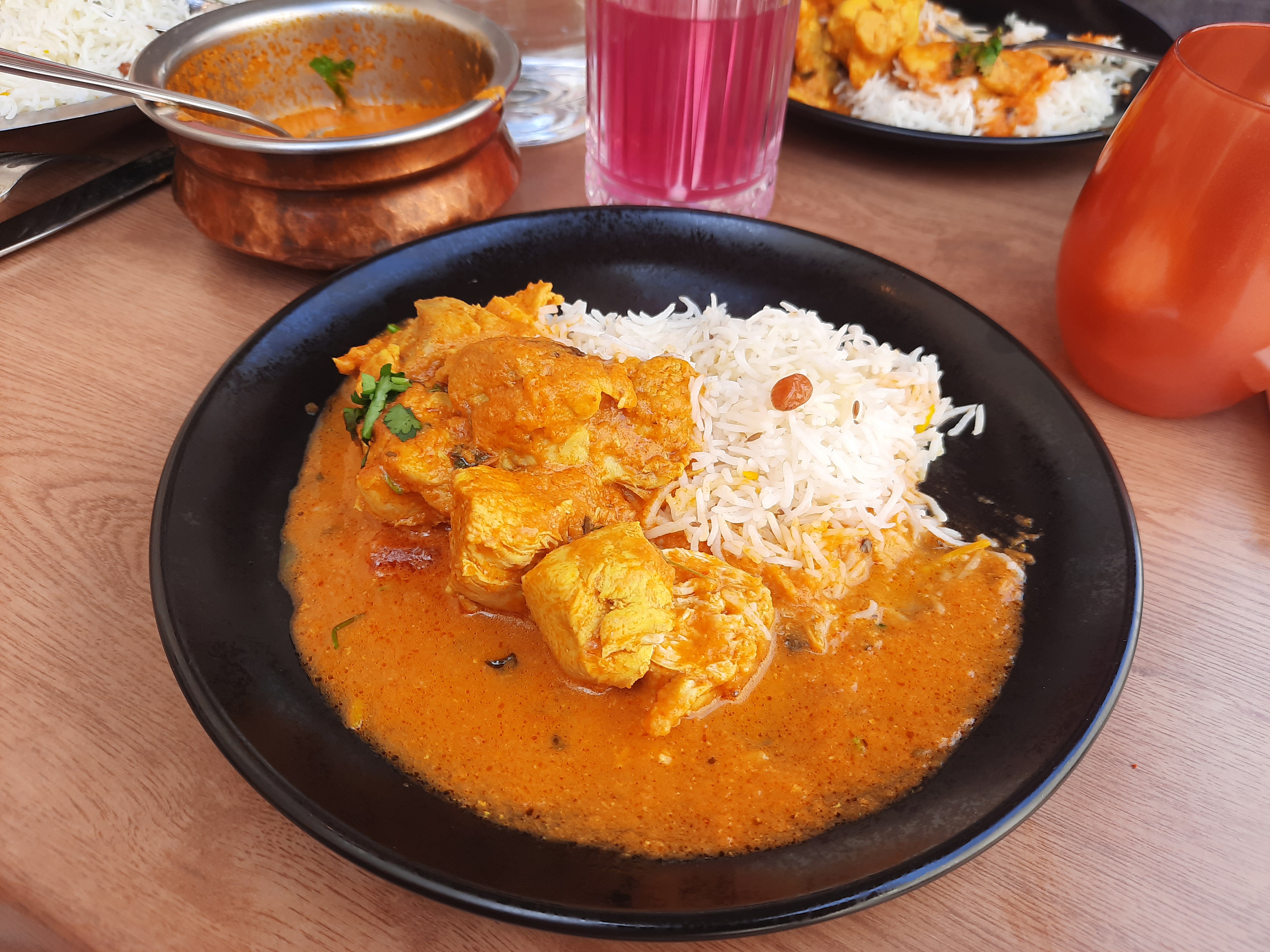 Poulet Korma délicieux Bonne quantité Très bien situé Cheese nan à la vache qui rit, comme en Inde ...j aime bien aussi la version avec emmental.
