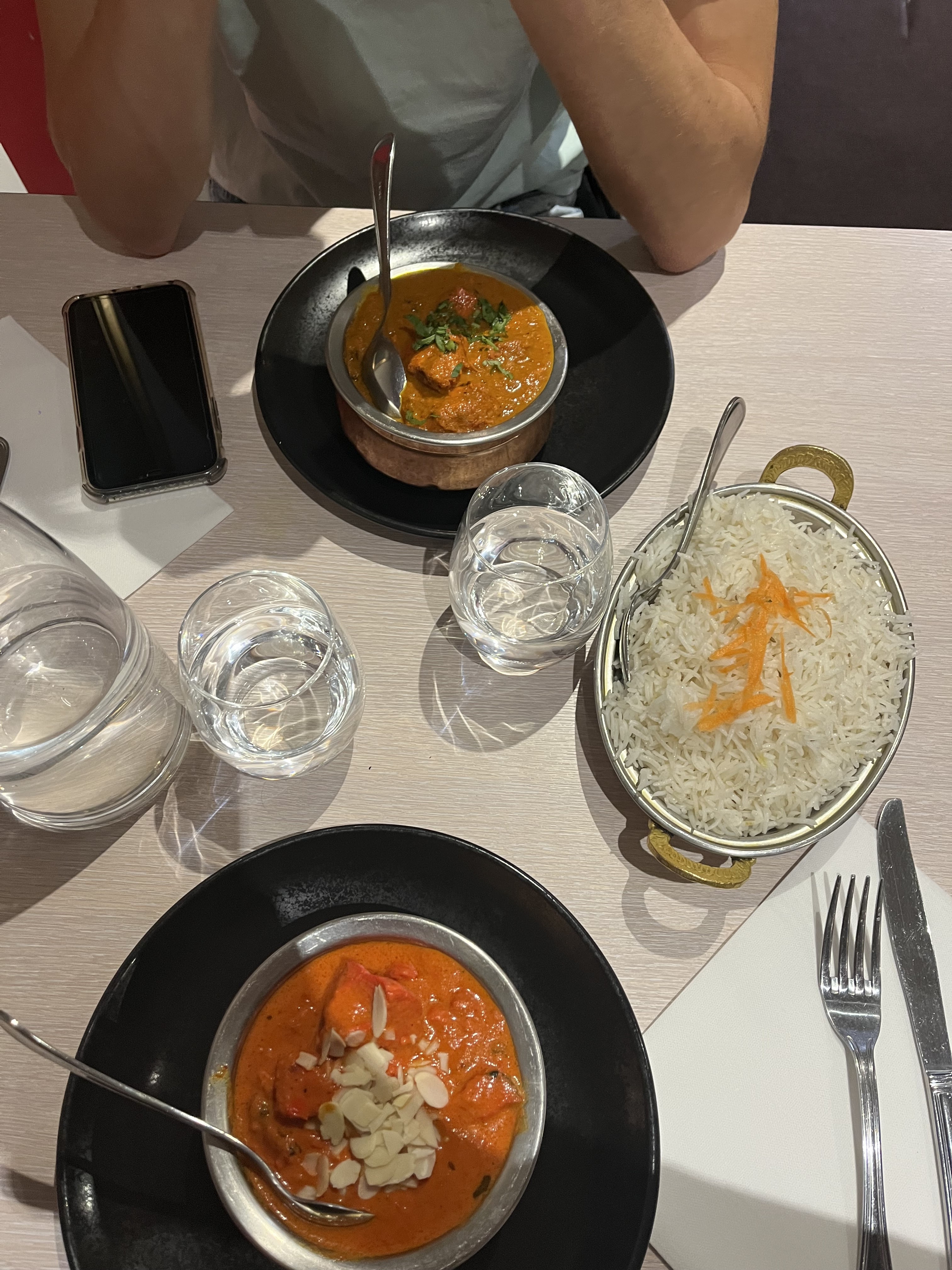 Nous n’avons pas vraiment aimé. Pas mauvais mais assez fade: un shahi korma sans beaucoup de saveur (j’ai eu envie de rajouter du sel, j’ai l’impression qu’il n’y avait aucune épice ) et un cheese nan sans cheese. Je sais que beaucoup de restaurants indiens s’adaptent aux palets français mais là un peu trop pour nous!