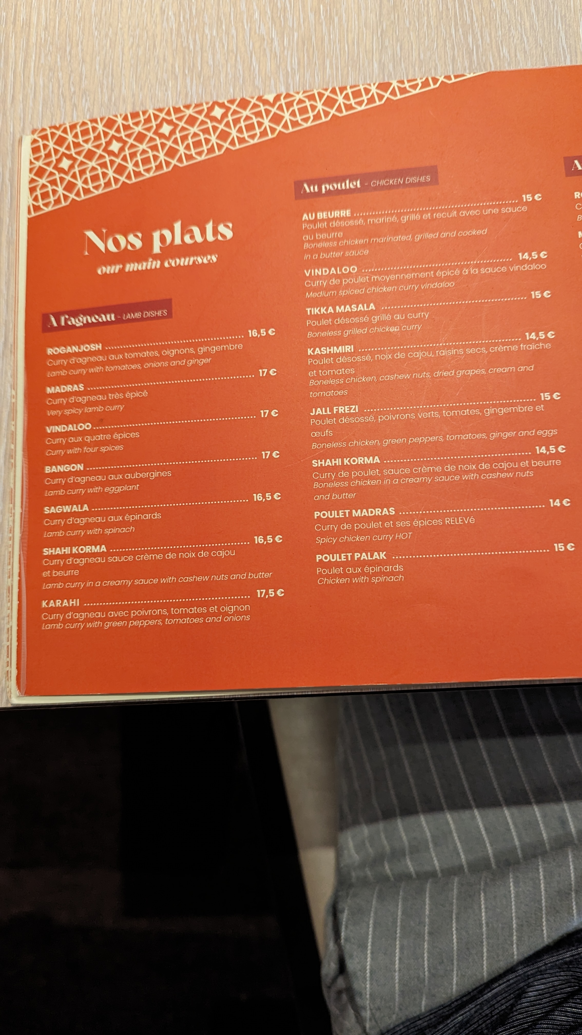 Les plats sont bons, le cadre est moyen... Les portions sont un peu light niveau viande. Peut-être un peu cher... (4€ le naan fromage)